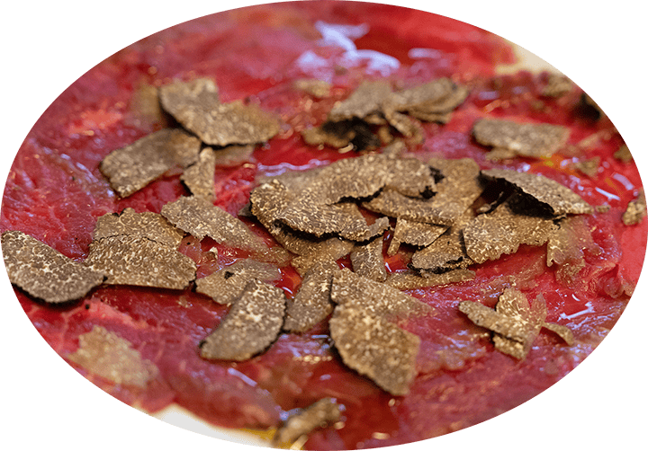 Carpaccio de bœuf, lamelles de truffe noire, roquette, huile de truffe.