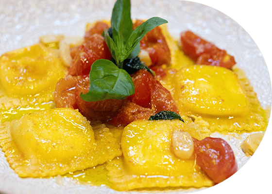 Ravioli, cœur de burrata, sauce tomate fraîche, basilic.